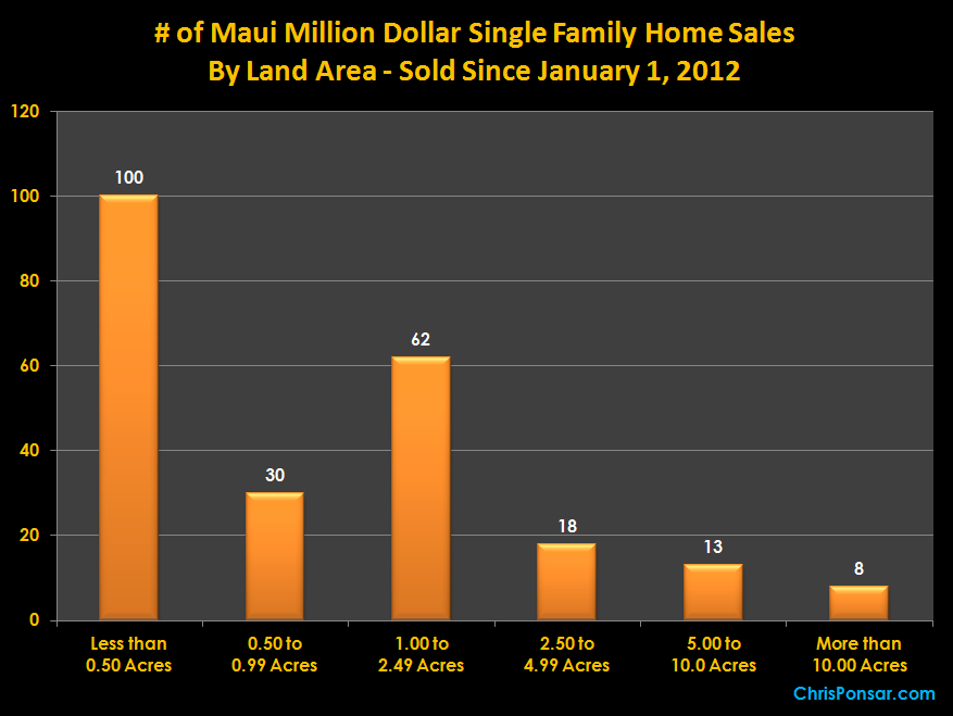 If you are unfamiliar with the luxury home market in Hawaii, the data presented on this graph might be counter-intuitive.  As  shown, most million dollar home sales are on lots that are smaller than half an acre in size, and only a handful of transactions are on tracts larger than ten acres.