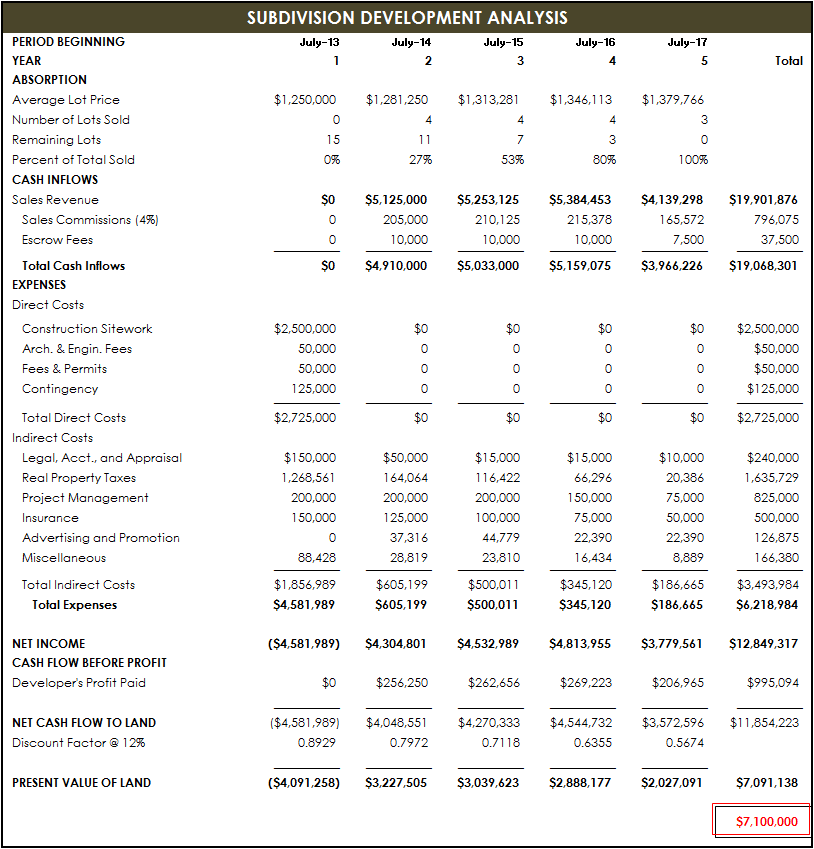 Discounted Cash Flow Analysis / Subdivision Development Analysis